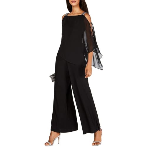 This modern alternative to a formal dress offers the comfort of wide-leg trousers paired with a flowing chiffon overlay that creates a graceful, cape-like silhouette.